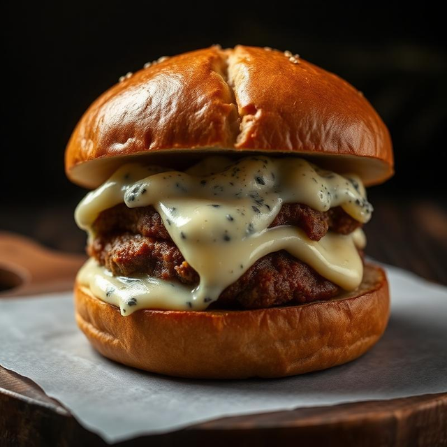 Pain Bun aux céréales, Steak Haché du boucher 150g (Charolet/Halal), Bleu d' Auvergne AOC, Poires Caramélisées, Noix Concassées, Roquette, Filet de Balsamique.