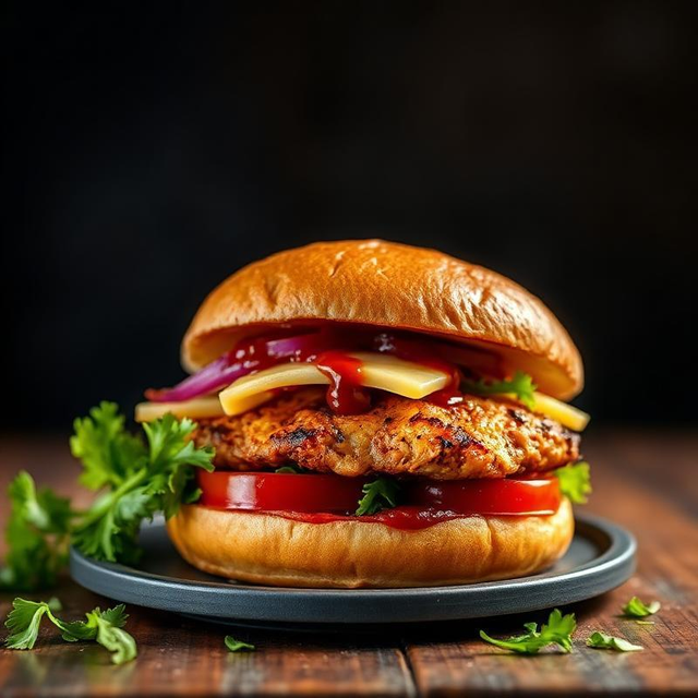 Pain Bun artisanal, Filet de Poulet Grillé Mariné Halal, Cheddar affiné, Mélange de Salade, Tomate, Sauce BBQ au miel et à la moutarde, Oignons Croustillants.